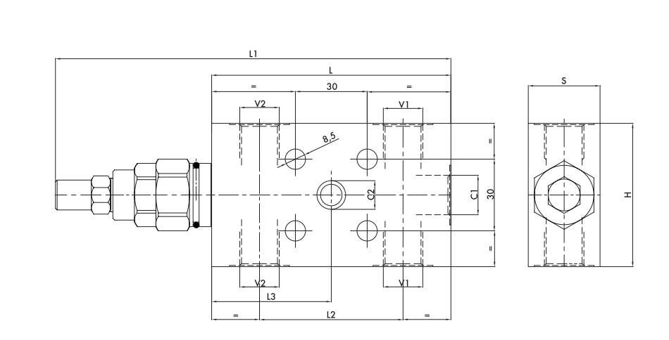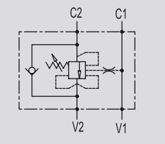 Соедините V1 и V2 c гидрораспределителем, фланец С2 напрямую к гидроцилиндру (мотору) на ту сторону, которую необходимо контролировать, С1 свободный поток.