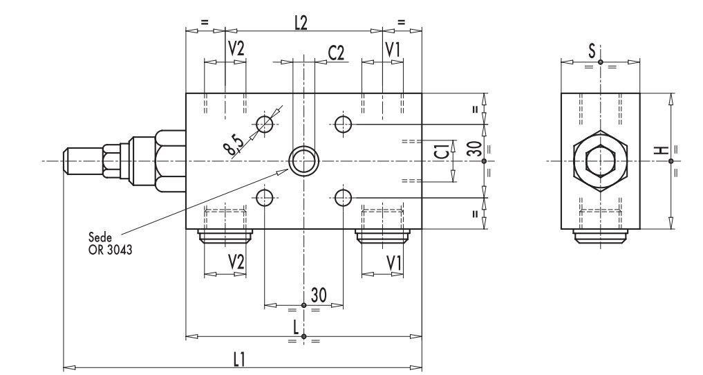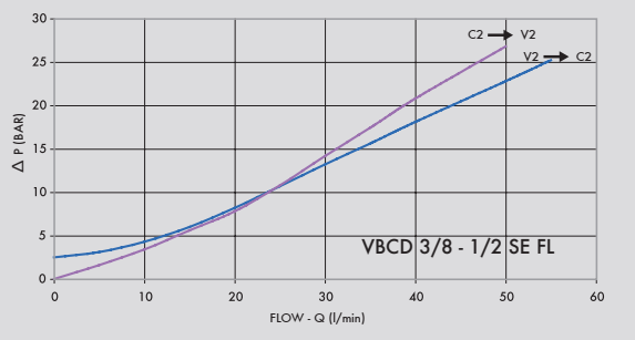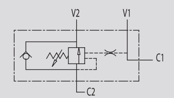 Соедините V1 и V2 c гидрораспределителем, фланец С2 напрямую к гидроцилиндру (мотору) на ту сторону, которую необходимо контролировать, С1 свободный поток.