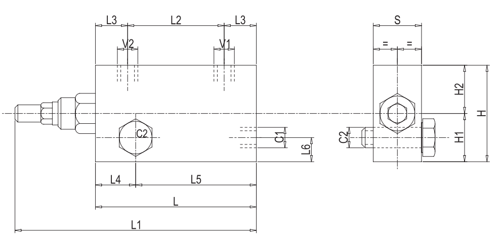 Соедините V1 и V2 c гидрораспределителем, фланец С2 напрямую к гидроцилиндру (мотору) на ту сторону, которую необходимо контролировать.